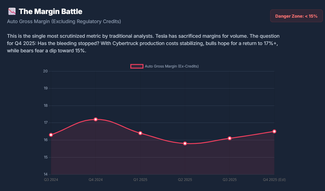 The Metric that Matters: Automotive Gross Margin. With price cuts having eroded profitability throughout 2024 and 2025, investors will be laser-focused on whether margins have bottomed. Analysts are projecting automotive gross margin (excluding regulatory credits) to fall to approximately 14.3% – 14.8%.