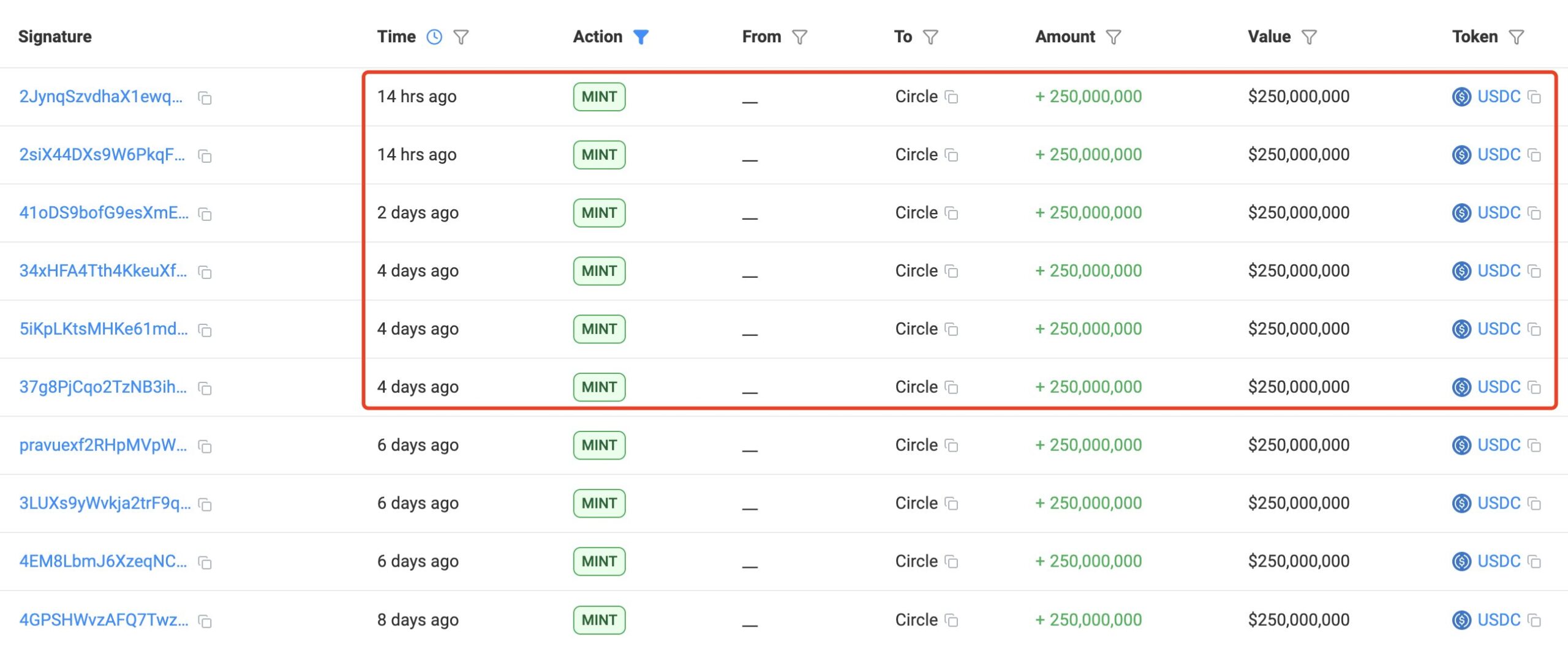 Lookonchain notes that Circle has minted 250 million USDC six times since the crash, each within short intervals, underscoring strong and consistent demand for dollar-backed assets. These minting events — often used to meet institutional or exchange-level liquidity needs — suggest that large players are positioning capital in anticipation of potential volatility or future accumulation opportunities.