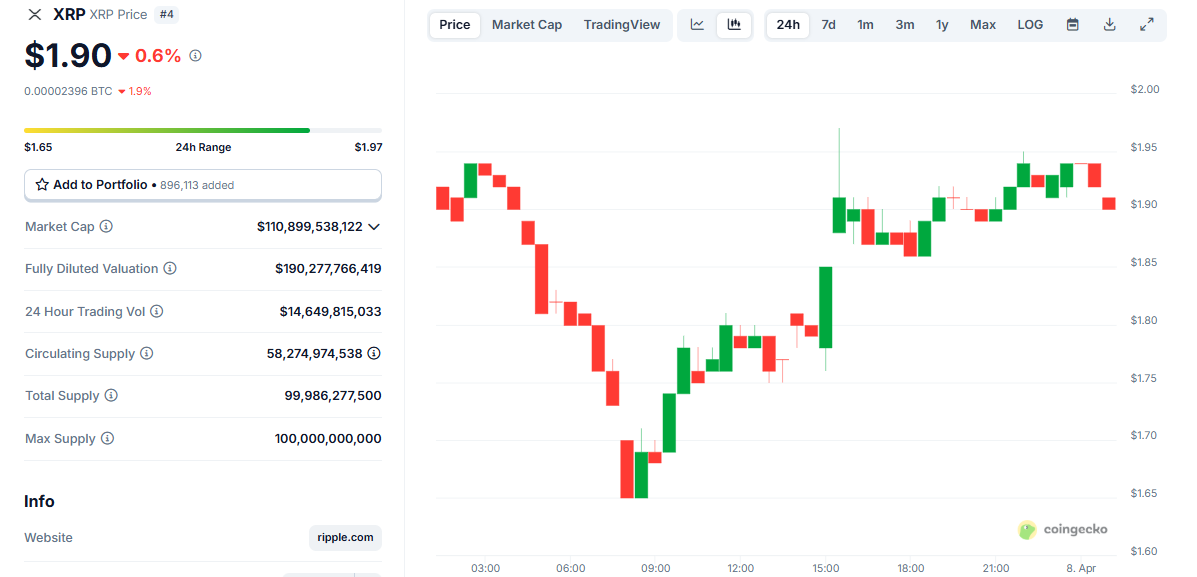 Stephane Ouellette, FRNT Financial Inc. How did XRP react? It didn’t. The entire market is in deep red. In the last two weeks, XRP has fallen 22.4%, down to US$1.90 (AU$3.17).