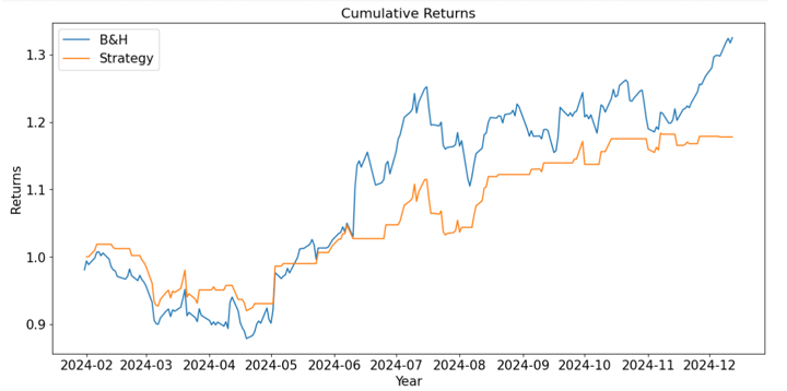 We can see that, overall, we get better results using the Buy-and-Hold strategy. Even though the annual return is higher for the B&H strategy, the volatility is lower for the ML strategy using the synthetic data for backtesting; although the B&H strategy has a higher Sharpe ratio. The Calmar and Sortino ratios are higher for the B&H strategy, although we obtain a lower max drawdown with the ML strategy.