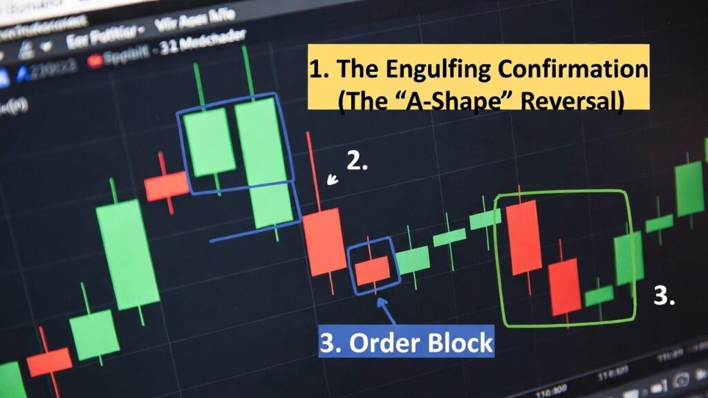 1. The Engulfing Confirmation (The “A-Shape” Reversal)