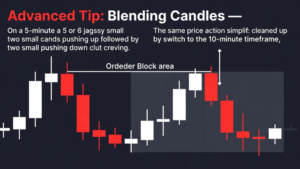 Technique: Use “Blended Candles.” If you are watching the 5-minute chart and see two small candles pushing up and two small candles pushing down, switch to the 10-minute timeframe.