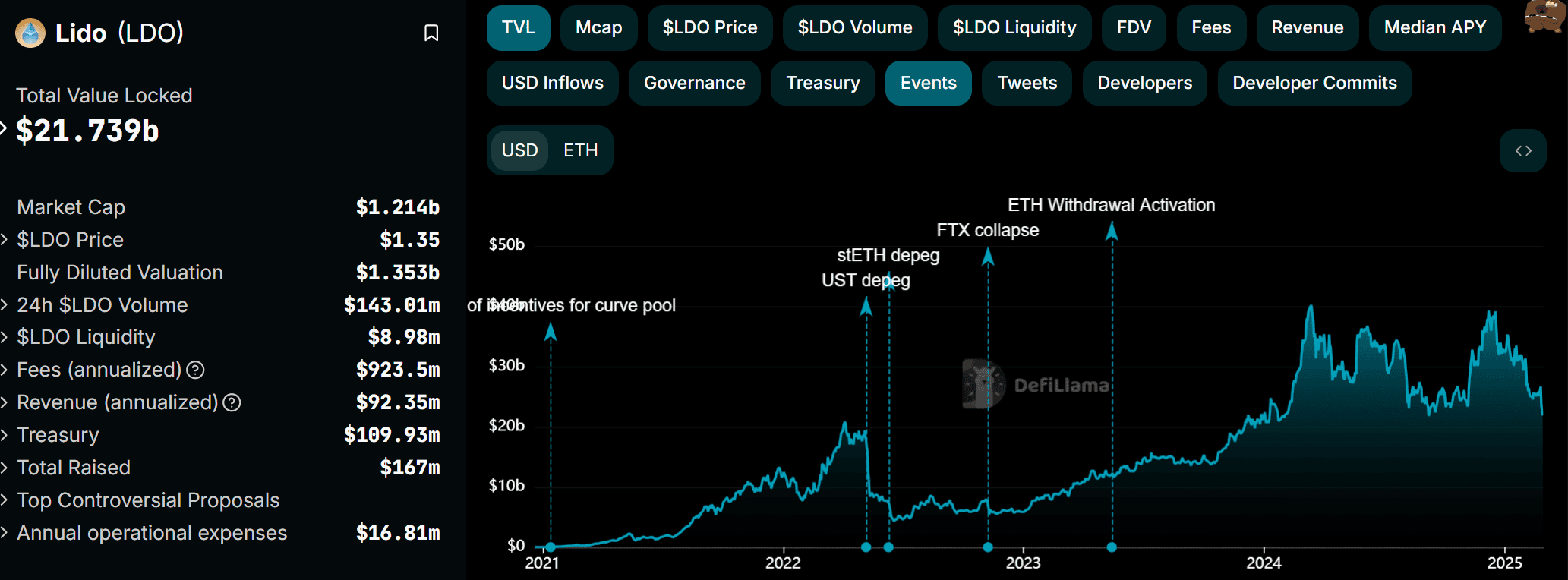 Lido is the largest decentralized liquid staking platform in the industry, reaching a peak of roughly $40B in total value locked (TVL) in mid-2024, representing a massive share of the total DeFi TVL.