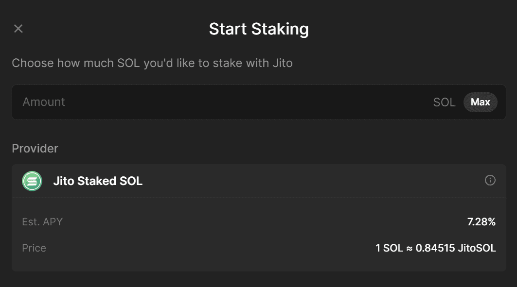 Phantom offers two options: native staking, where you simply lock up assets in the Solana blockchain, and liquid staking using Jito.