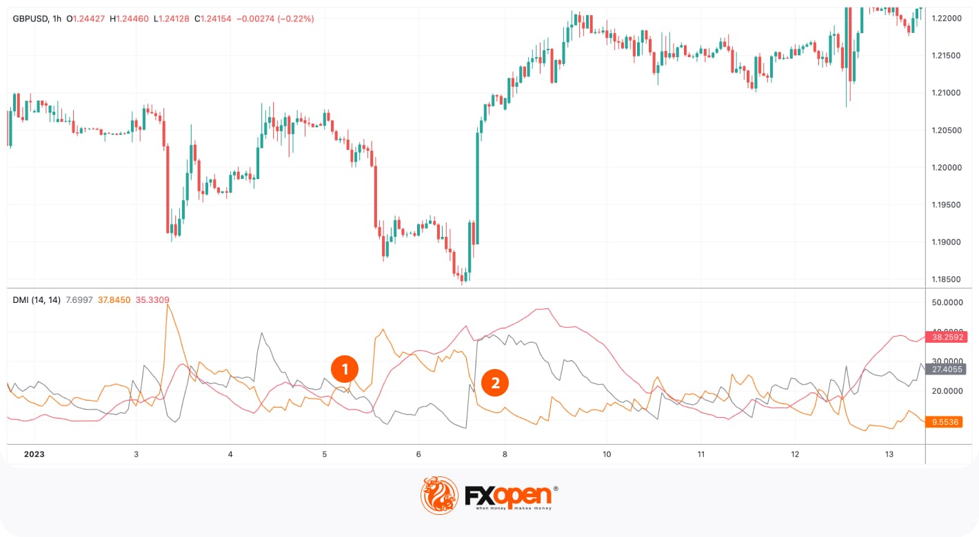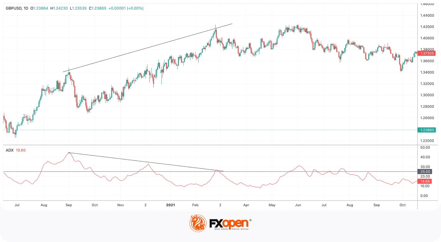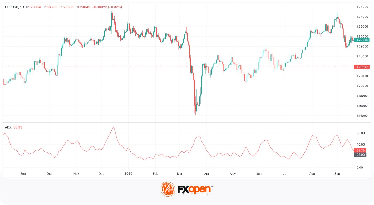 A decline in the indicator usually alerts traders to a change in the price direction. So, if a trader considers medium-term trading, it’s an opportunity to exit the market with the largest potential return. If a trader considers longer-term trading in a solid trend, they can use the ADX to partially close trades. Every time the indicator sets a new peak and decline, the trader could close a trade.