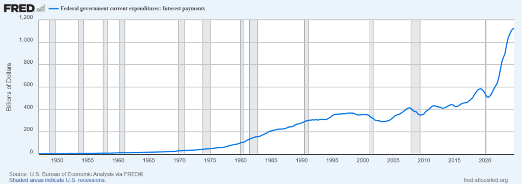 Here’s a stat that should make your blood boil: America now spends more on interest payments than we do on defending the country. Think about that. We’re not paying for roads, schools, or safety, we’re just feeding the interest beast. Over $1 trillion a year just to keep the debt from getting repo’d. That’s like taking out payday loans to pay off your student loans. And there’s no exit ramp unless we completely rethink how this country handles money. Here a chart to demonstrate our interest payments –