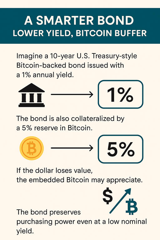 Imagine a 10-year U.S. Treasury-style Bitcoin-backed bond issued with a 1% annual coupon, far below the standard 4.5% yield on traditional Treasuries. At first glance, that seems unattractive. But here’s the twist: the bond is collateralized by a 5% reserve in Bitcoin, held in cold storage by a third-party custodian or even on-chain via a multi-signature setup. The principal and interest are still paid in dollars, but the Bitcoin reserve acts as a built-in hedge — a kind of “debtor insurance” for the bondholder against the erosion of purchasing power.