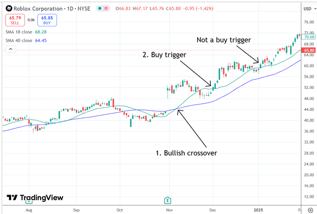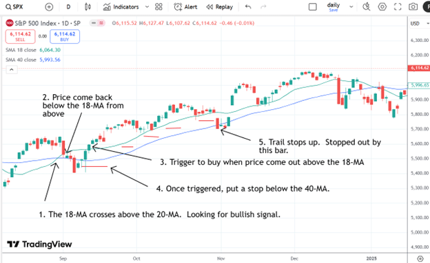 After the cross, we wait for the price to drop back down below the 18-MA back into the zone defined by the 18-MA and the 40-MA (see point 2 in the graphic).