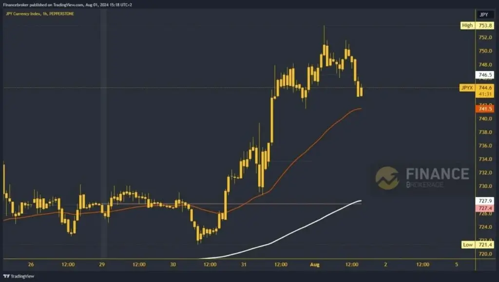 For a bearish option, we need a negative consolidation and pullback below the EMA 50 moving average. This is a sign that the yen is in trouble, and we will be looking for a pullback and new support. Potential lower targets are 740.0 and 738.0 levels. The EMA 200 moving average is moving down in the zone of 728.0 levels. On Tuesday, the Bank of Japan increased the interest rate from 0.10% to 0.25%, which positively affected the yen, and based on this, we expect a strong yen in the coming days.
