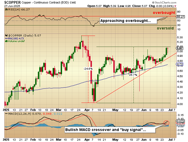 The CNN Fear-Greed Index is sitting at a moderately bearish 65, which places it in the position of The grey-haired professional money gang are waving their fingers and muttering “Tsk-Tsk,” pointing to Warren Buffett’s $300 billion cash position as justification for being “underinvested” in this rally, which is the strongest and most violent equity market rebound in the history of global stock exchanges. In other words, the kiddies that are normally the “suckers at the poker table” are now raking in their obscene profits leaving the older more conservative crowd in their dust. I am modestly hedged via volatility positions and one “bleeding-from-the-eye-sockets” short via the inverse QQQ ETF (SQQ:US), which I have stubbornly refused to jettison, but only because I had a similar problem last July when I was seriously submerged on a position in the UVIX:US before the early-August “Japan carry-trade” crash rescued me, taking a 30% loss to a 405 win in under two weeks. That is what I expect to transpire in the latter part of July and lasting right through to mid-October, so the $90 million question is “When do I add?” to both volatility and to the SQQQ:US in order to capture the next correction. Stay tuned. After the absurdity of the one-week crash that ended on April 7, with the “Liberation Day” lows in stocks, gold, copper, and nearly everything else that lives and breathes off the Trump tweets, copper has been on a tear to the upside, closing above $5.00/lb, for the first time since late March. This week, the red metal reclaimed that level on the heels of a report out of the LME that has copper inventories at their lowest level in decades, with a similar condition affecting the Shanghai futures exchange. Also suffering is the mighty COMEX, where everything copper-related is being hoarded as the looming shortages appear not only on the horizon but just ahead of the grill of one’s car. The world will soon realize that leftist and “woke” policies prohibiting the exploitation of the planet’s mineral wealth ultimately rise up to “bite you in the butt” making the construction of new copper mines prohibitively expensive with prices under US$15,000 m/t (US$6.80/lb.). Those near-sighted policies of the past decade or so have resulted in no new mine supply coming on stream so when combined with the depletion from exhausted, mined-out sources in Chile and Peru and Canada, there is a looming and very real shortage about to materialize that is going to send prices spiraling northward for the balance of the decade. The folks over at Crux Investor have published a superb article on copper entitled: “How Copper Supply Deficits Are Reshaping the Critical Minerals Landscape,” and I urge all readers to take some time to study it at this link. I see new highs on the immediate horizon for copper and a robust second half of 2025 for the copper developers, with particular attention to those with new discoveries. Of note this week was the $12 million LIFE financing announced by one of my absolute favorites, Fitzroy Minerals Inc. (FTZ:TSX.V; FTZFF:OTCQB) that has won the affections of a number of the institutional investors including a US$1.8 billion Asian mining fund whose lead order of $5 million was a huge testimonial to the quality of both management and their two exciting projects in Chile, Caballos and Buen Retiro. The deal is expected to close next week, oversubscribed and trading at a premium to the issue price on excellent volume.Copper
