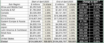 At the start of the month, as has been the case for much of the last decade, the focus was on technology, partly because of its large weight in overall equity value at the start of 2025, and partly because of the punishment meted out to tech stocks during the first quarter of the year. Focusing just on US equities, technology companies, which accounted for 29.4% of the overall market capitalization of all US companies at the start of 2025, lost $2.34 trillion (about 13.19%) in market capitalization in the first quarter of 2025. In the first few days of April, that trend continued as technology initially led the rout, losing an additional $1.78 trillion, but by the end of April, tech had made at least a partial comeback: