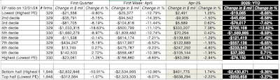 Staying in the weeds, I also looked at the push and pull of growth versus value, by breaking US equities down into deciles based on earnings to price ratios and assessing their performance leading into April and in April 2025 alone:
