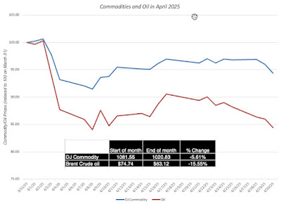 During April 2025, commodity prices were also on the move, and in the graph below, I look at oil prices as well as an overall commodity index during the month: