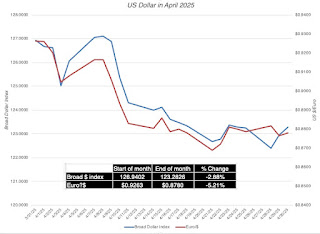 The dollar continued its decline in April, down about 3% against a broad basket of currencies, and more than 5% against the Euro.