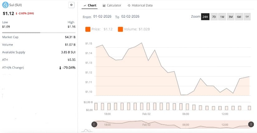 Sui is down to $1.12 as it faces ongoing bearish pressure, Source: Brave New Coin