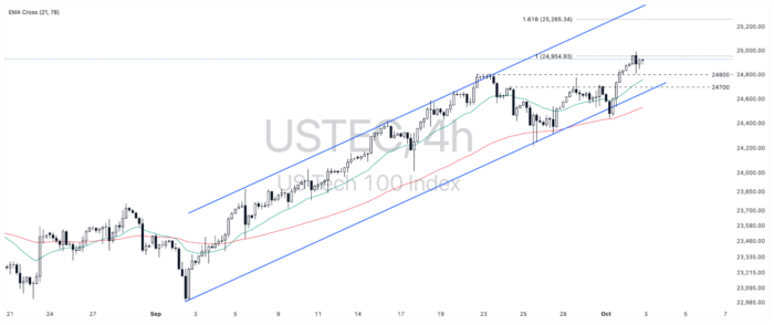 If USTEC breaks above 24955, the index may test the 161% Fibonacci Extension at around 25265.