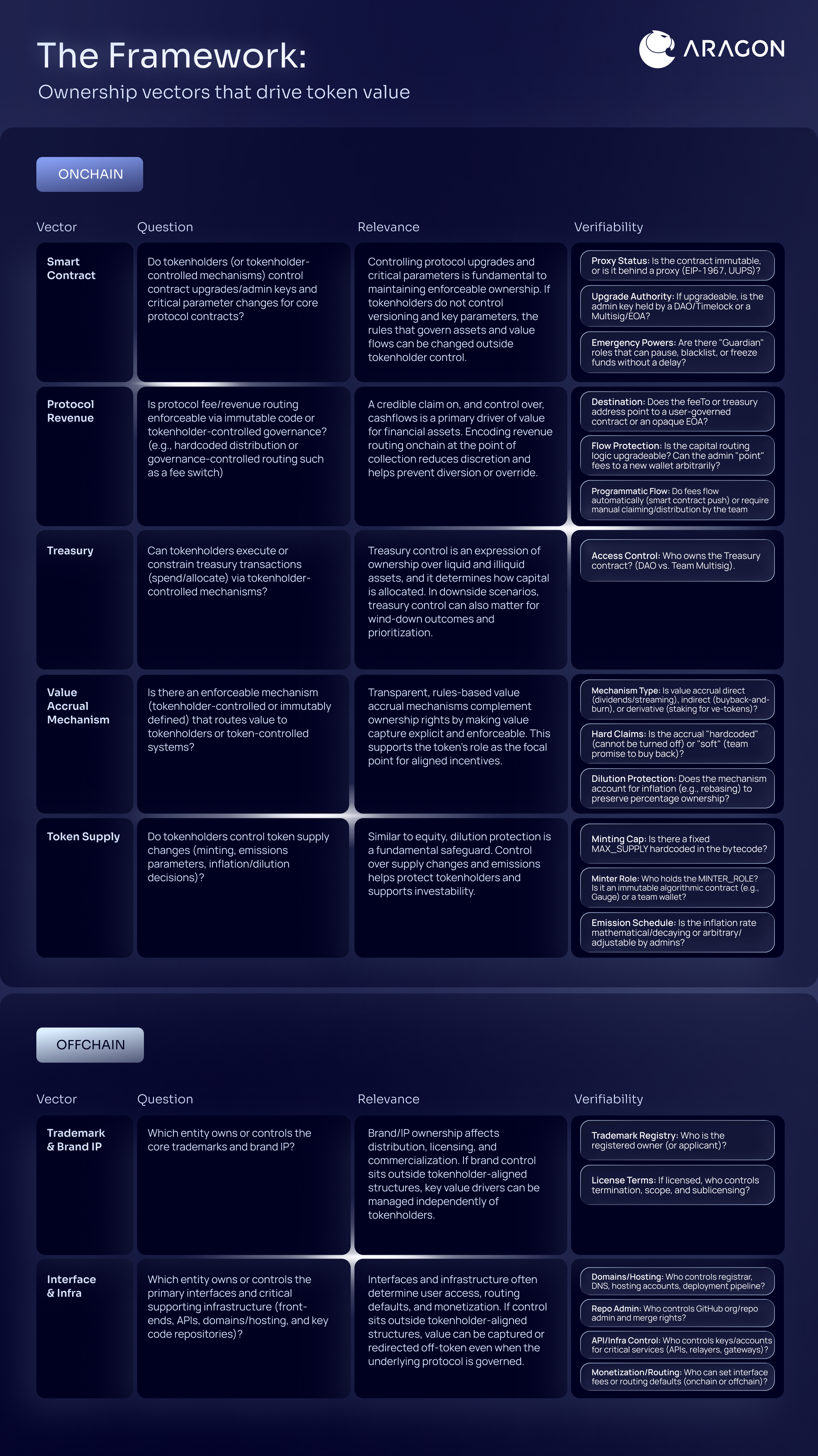 - Make diligence faster and more objective for investors. Tokens have too often been underwritten on narrative because ownership rights and value accrual weren’t legible. The dashboard standardizes how these claims are evaluated—and points to concrete onchain and (where relevant) offchain evidence behind them.
