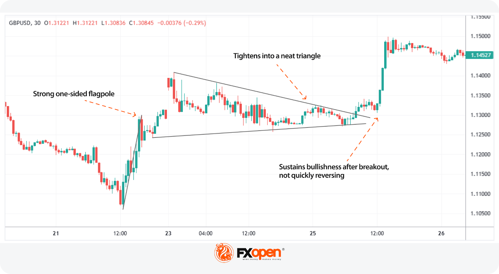 - Clear Structure: Pennants have three clear parts — the sharp flagpole, the tight consolidation, and the breakout offer a straightforward sequence.