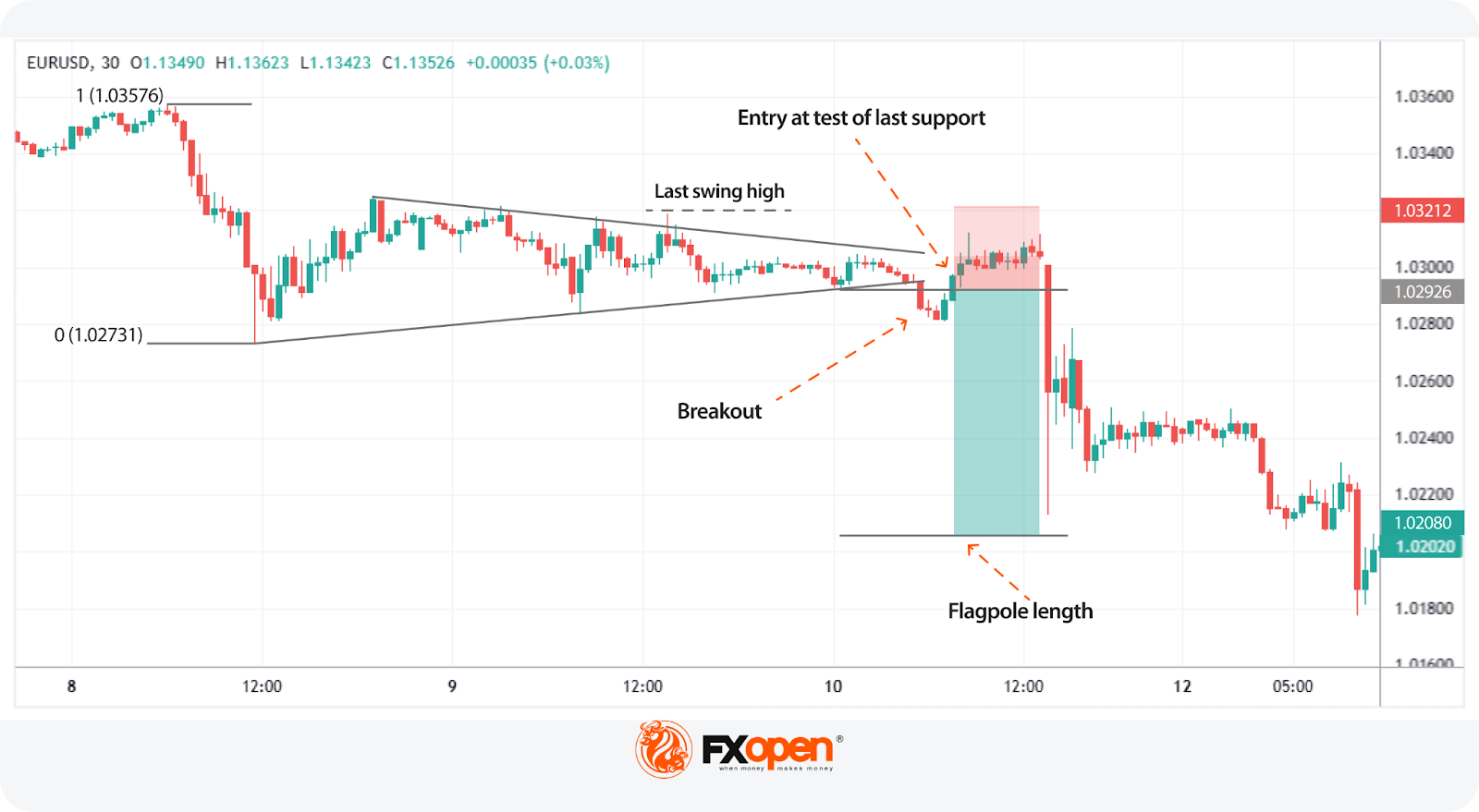 Traders usually wait for the price to break out of the pennant, ideally on rising volume, in the same direction as the initial move. The height of the flagpole is typically used as a rough target, while stop losses are set beyond the last swing high/low.