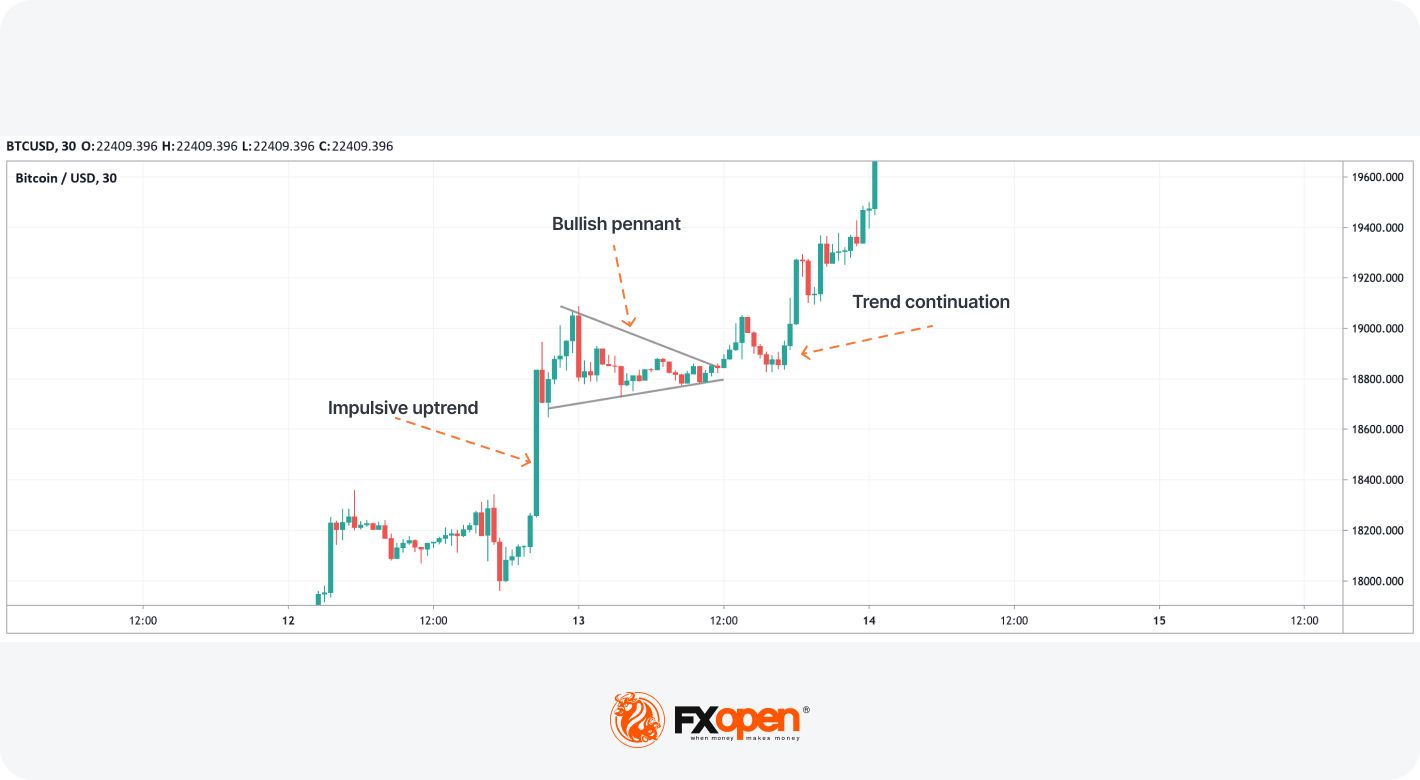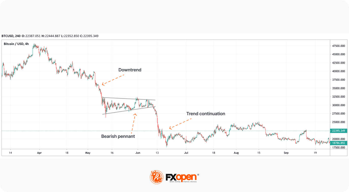 This is the case with the bearish pennant. On the Bitcoin chart above, we determined a period of consolidation after an impulsive move and drew two converging trendlines. After the pennant was formed, a downtrend continued.