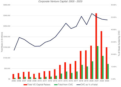 - The key difference, at least as I see it, is that within each of the funded groups, there is not enough pruning of the worst performers, partly because the funders do not or will not demand accountability and partly because the mixed mission statements allow poor performers an excuse for under performance. In contrast, the worst performers in their peer groups are quickly stripped of their funding and drop out of existence. In 2023, an admittedly bad year for venture capital, 38% of active venture capitalists dropped out of deal making. While active funds don’t have as high a drop-out rate, the amount of capital that they invest is sensitive to how they perform in market. That absence of ruthlessness on the funding level for under-performing CVCs and SWFs can trickle down to the companies they fund, with funding lasting much too long, before the plug is pulled.