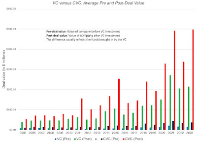 Corporate venture capital tends to invest in much bigger companies than the conventional venture capital with an average post-deal value of $500 million in 2023, compared to $210 million for conventional VC.