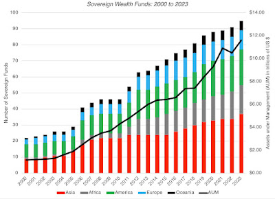 The sovereign fund universe has increased dramatically in the twenty first century. In the graph below, I look at the number of sovereign wealth funds in existence, by year, and the aggregated value of these funds: