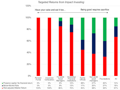 Of the three groups that we look at in this post, green investing’s motives should be the simplest to disentangle. It is to push the world away from fossil fuels to alternative energies, but that is where the consensus ends. For some players in this space, reducing the carbon footprint and fighting climate change is the core mission, with returns being a constraint rather than an objective. Thus, for foundations and perhaps even some endowment funds, investing green with as little loss in returns as possible becomes the mission statement. Unfortunately, the bulk of green investors want to have their cake and eat it too. Among impact investors, a prime source of funding for green investors, a significant majority of impact investors (close to 64%) want to have their cake (at or above-market returns, given risk) and eat it too (by making an impact).