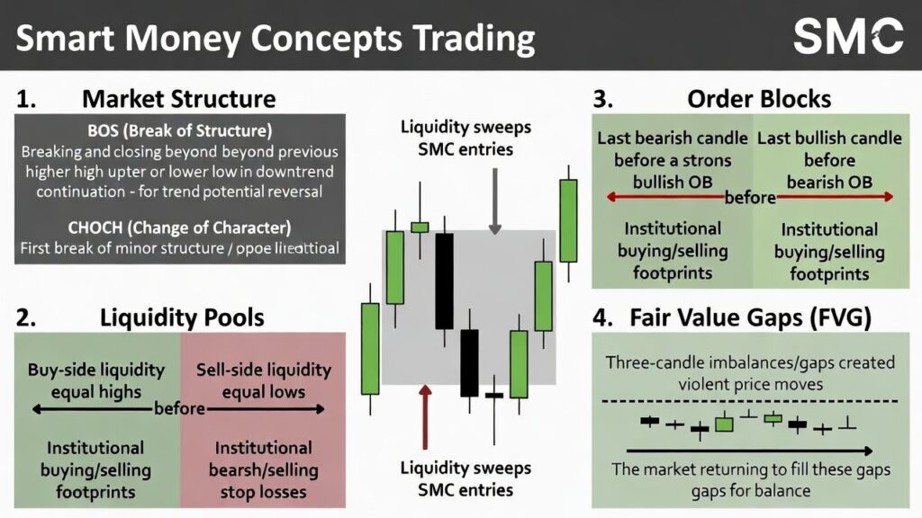 To master any SMC entry model, you first need to understand the language of the Smart Money. You cannot spot the entry if you do not understand the setup. Here are the core pillars: