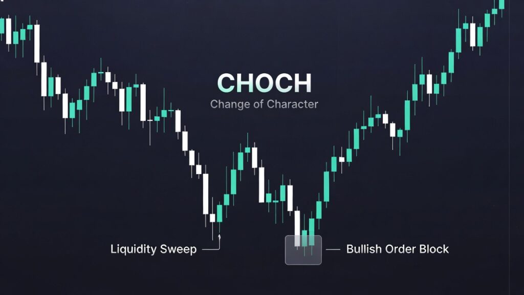 - The CHOCH: Immediately after the sweep, look for a violent reaction in the opposite direction that breaks a recent, minor structural point. This Change of Character signals the institutions have stepped in.