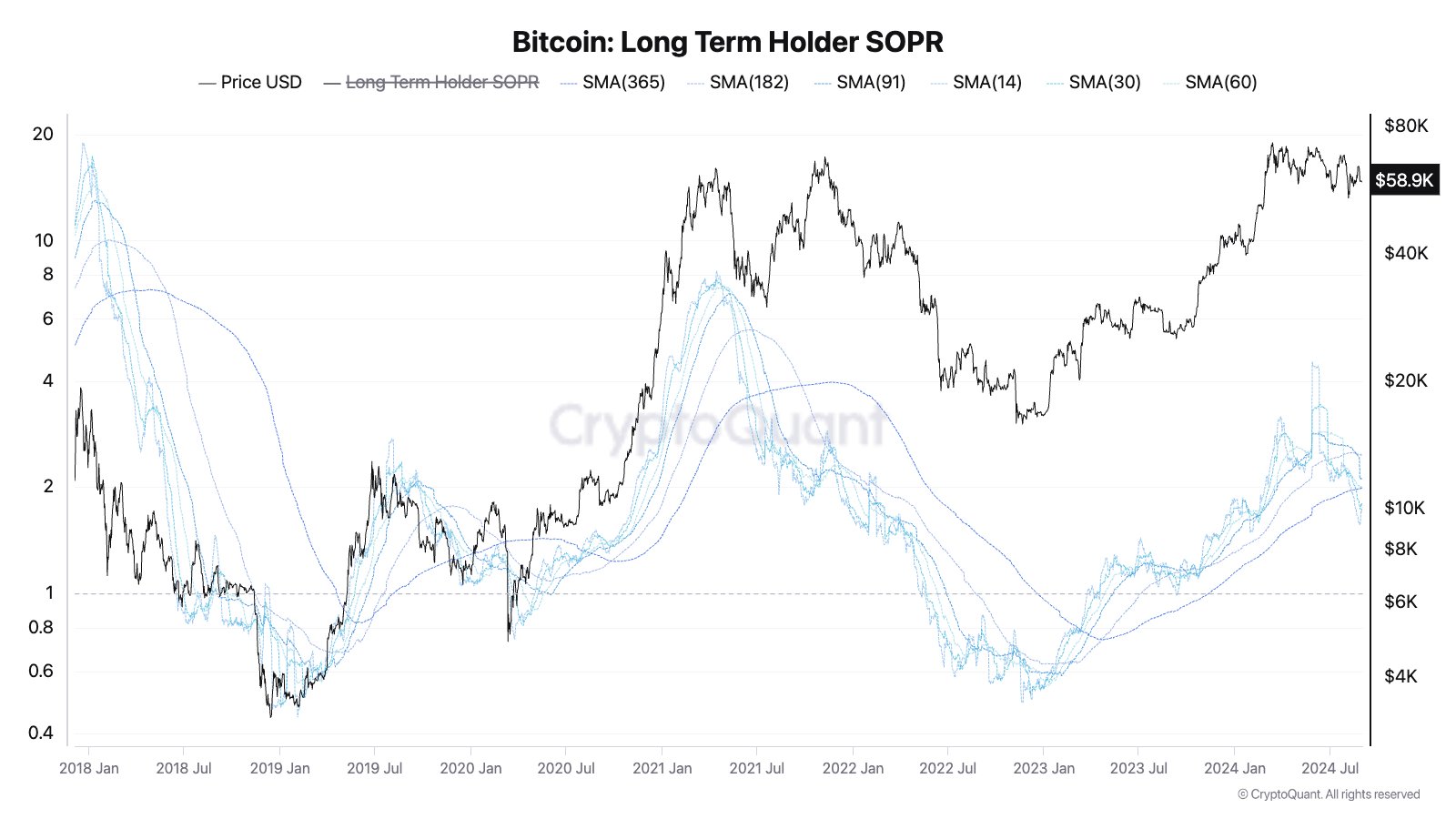 “Long-term holder SOPR ribbons: most moving averages are trending downwards since late July.