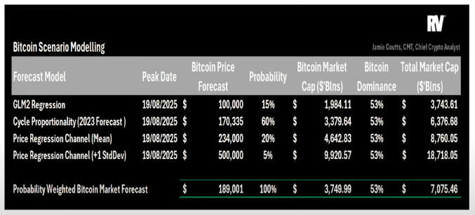 I don’t think Bitcoin is going to go parabolic to $500,000 this cycle. I see $500,000 in the future, not this cycle. So it’s a very low probability. And the outcome is just this probability-weighted market forecast of 189,000 for Bitcoin by August of next year, which will give it a market cap of around $3.75 trillion.”