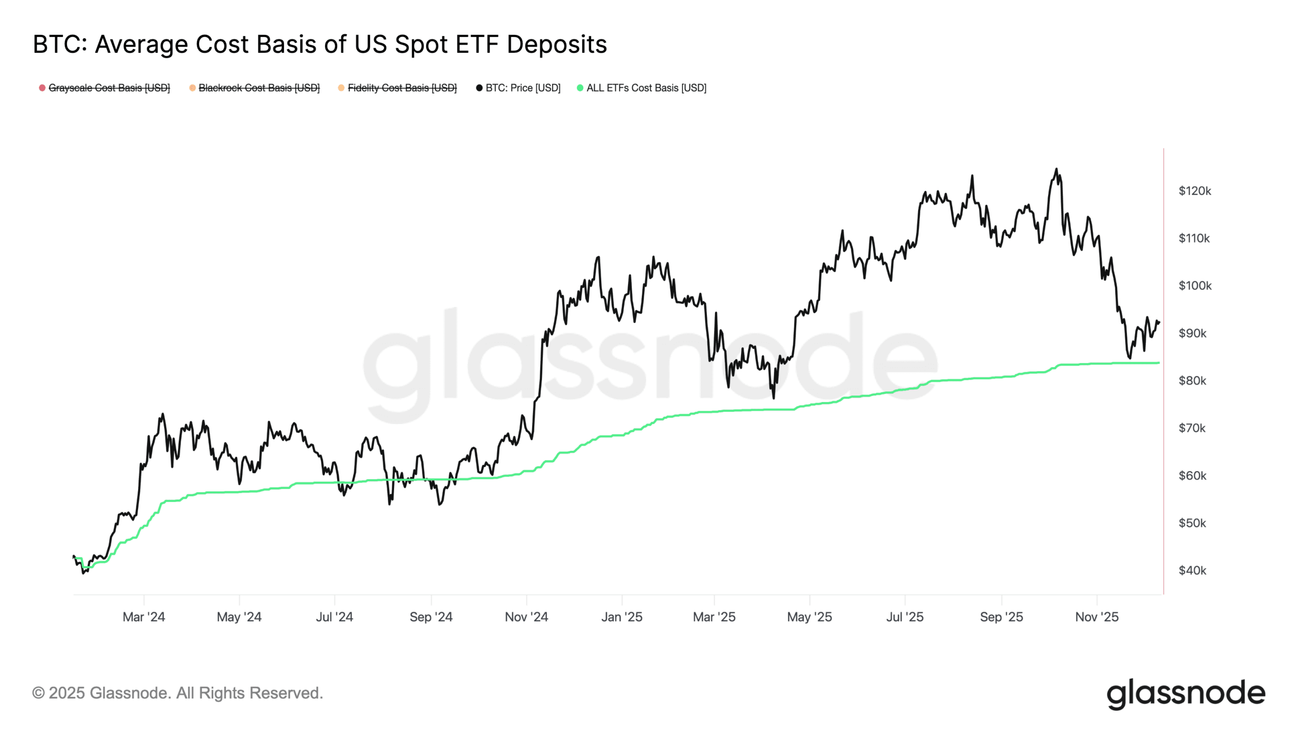Second, the U.S. spot ETF cost basis reflects the weighted average price at which bitcoin has flowed into U.S. listed spot ETFs. This is calculated by Glassnode using the combined daily ETF inflows with the market price.