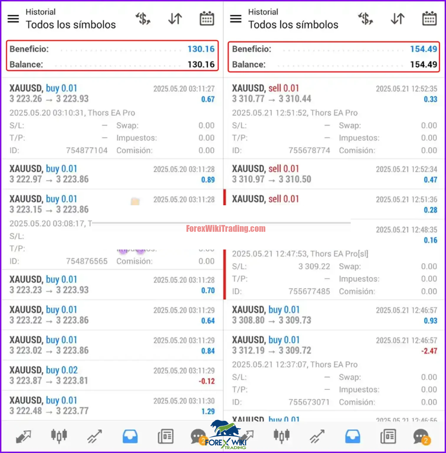 The following day, it engaged in both buy and sell positions, showing its ability to trade in both directions. One trade was closed by a stop-loss (S/L), highlighting that losses are part of the system. The overall result for the displayed periods was a net profit, turning a balance of 130.16 into 154.49.