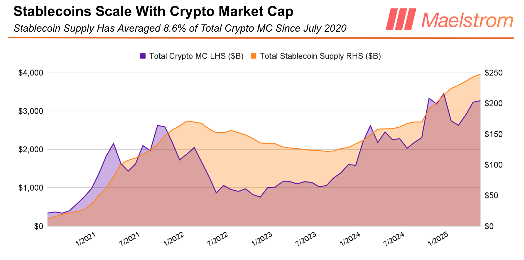 3. A rising crypto market creates massive inflows into stablecoins pegged to the USD. These issuers invest their AUC in newly minted T-bills, which finance the ever-expanding federal deficit.
