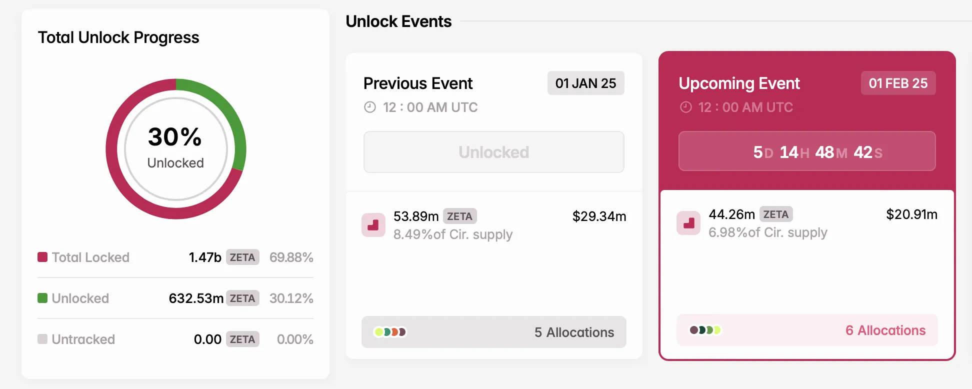 On February 1, ZetaChain will unlock nearly 45 million ZETA tokens. These tokens will fund initiatives such as a user growth pool, an ecosystem growth fund, core contributor rewards, advisory roles, and liquidity incentives.