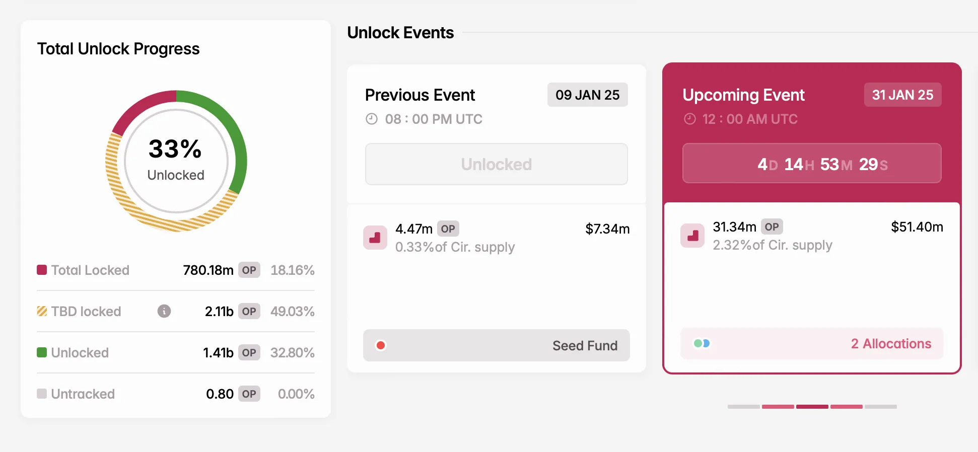 On January 31, Optimism will unlock 31.34 million OP tokens. According to Tokenomist (formerly TokenUnlocks), these tokens will be distributed to core contributors and investors.