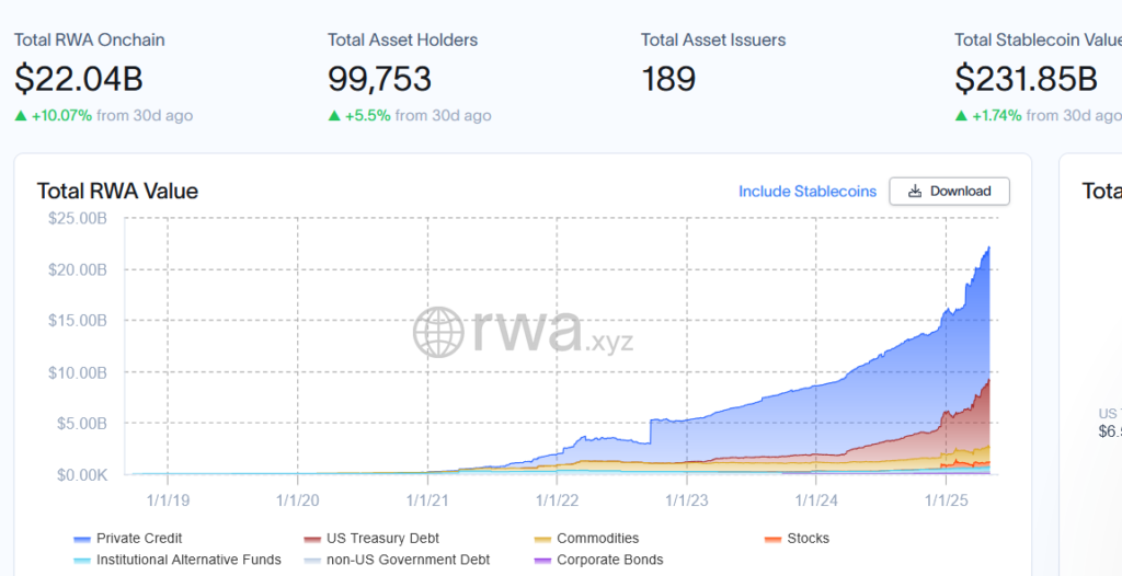 Total real-world assets onchain have reached an all-time high of $22.04 billion as of May 5, 2025, with figures up 10% over the last 10 days.