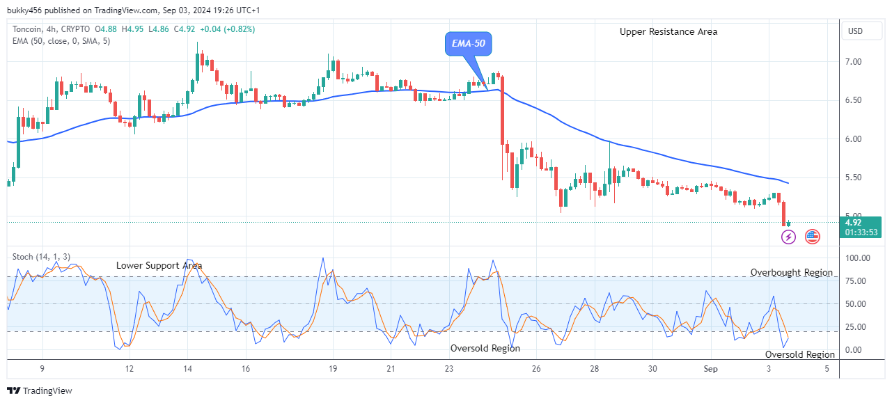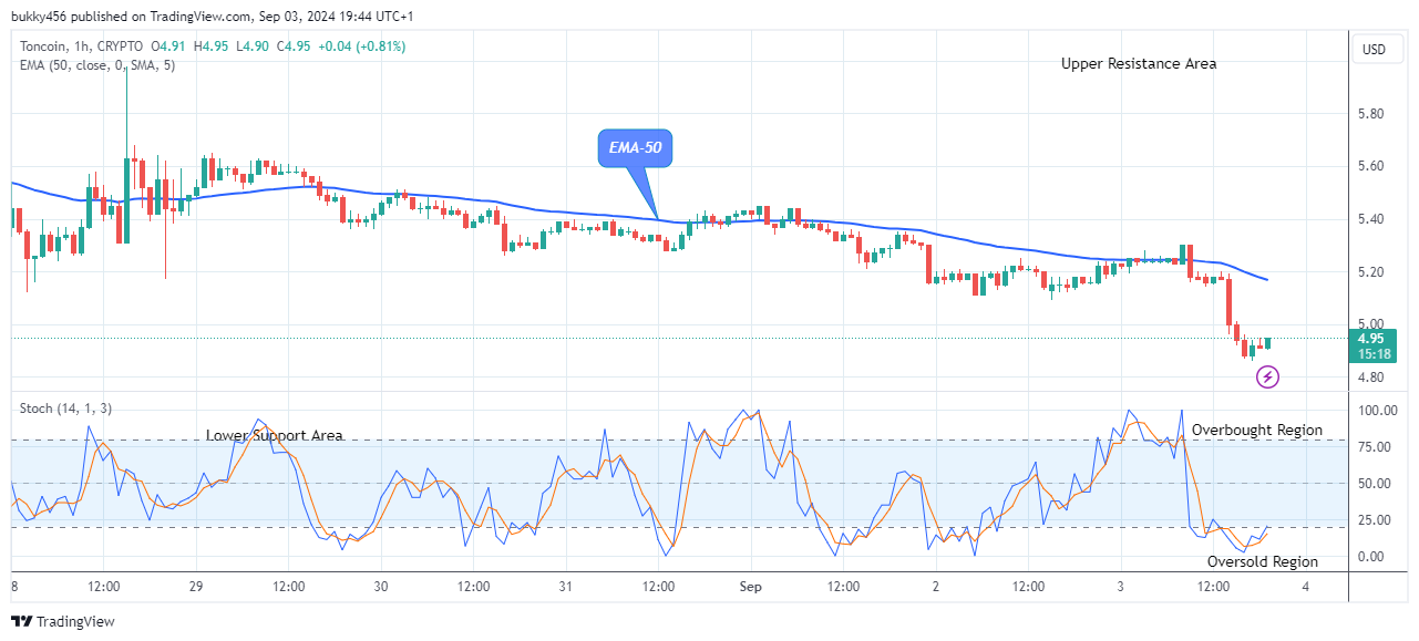 The Toncoin price experiences a bullish reversal at the $4.95 high mark below the EMA-50 as the 1-hour chart opens today, resulting in intraday gains. This shows the high impact of the buy investors on the coin market; likewise, the downside risk remained uncertain.