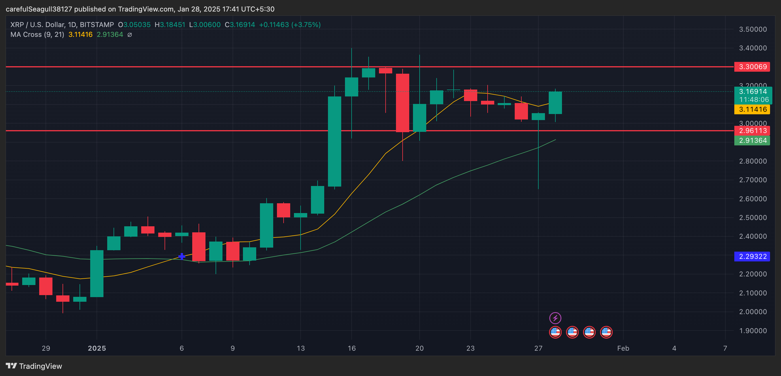 XRP, one of the largest altcoins, has already overtaken Dogecoin with its massive daily gains. The Ripple price surged by over 10% in the last 24 hours, making it trade at $3.09 with a market capitalization of over $178 billion. In case the token continues its ascent, then it will face resistance near $3.30.