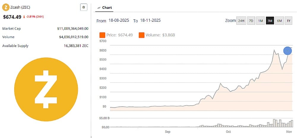 Zcash is trying to steady itself after last week’s sharp pullback, with the chart showing a bounce toward the $520 zone. Zcash slipped hard from its $750 peak but found buyers once the price dipped into support.