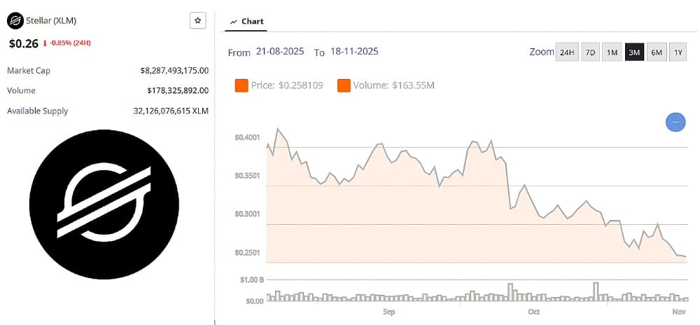 Stellar is sliding again, with the chart showing another dip toward the $0.26 zone after a week of choppy movement. Stellar has been stuck under key moving averages, and each bounce has faded quickly as sellers keep pressure on the trend.