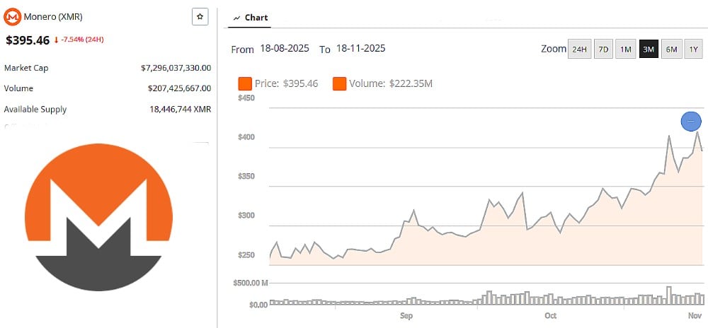 Monero is showing steady strength as it pushes toward an $7.5 billion market cap, holding firm after last week’s spike near the $420 resistance zone. The chart indicates that XMR is cooling off slight this week but remains above its previous support zone, and buyers are stepping in whenever the price starts to draw back.