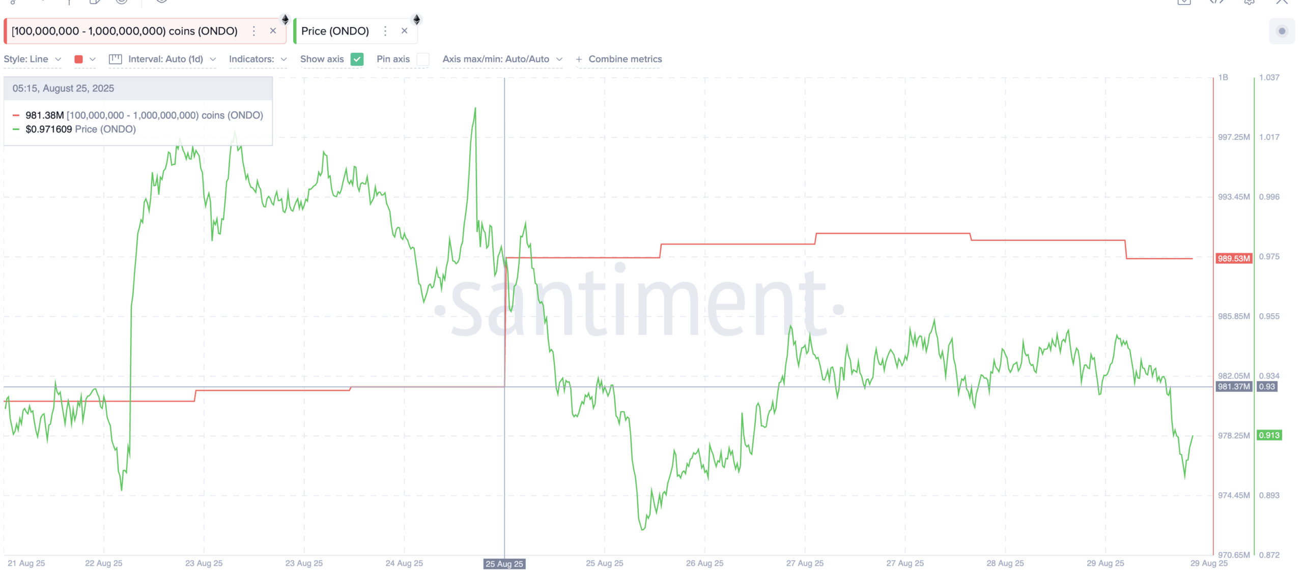 Whales have been quietly adding through late August. The 100 million to 1 billion ONDO cohort grew holdings from 981.38 million ONDO on August 24 to 989.53 million ONDO at press time. That is an accumulation of 8.15 million ONDO, worth about $7.4 million at current prices of roughly $0.91.