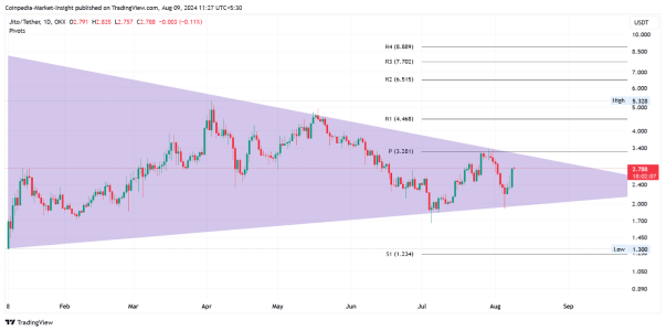In the daily chart, the JITO price action reveals a triangle pattern formation with the ongoing bull cycle gaining traction. With a morning star pattern, the V-shaped reversal within the triangle teases a bullish breakout as the market recovers.
