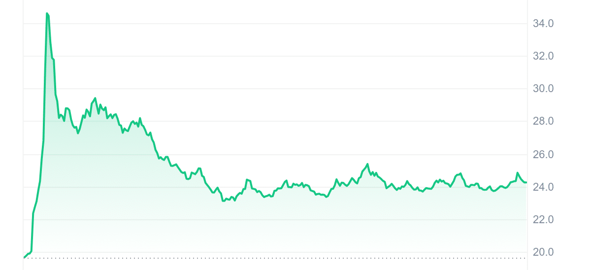 Rocket Pool’s current price is $24.30, with a 22.40% increase in the last 24 hours. However, over the past year, the price has decreased by 39%, underperforming 98% of the top 100 crypto assets. Also, it is trading 15.62% below the 200-day SMA of $28.87. With a 14-day RSI of 44.22, the cryptocurrency is neutral. Nonetheless, RPL has high liquidity, with a market cap of $496.16M and a 24-hour volume of $239.05M.