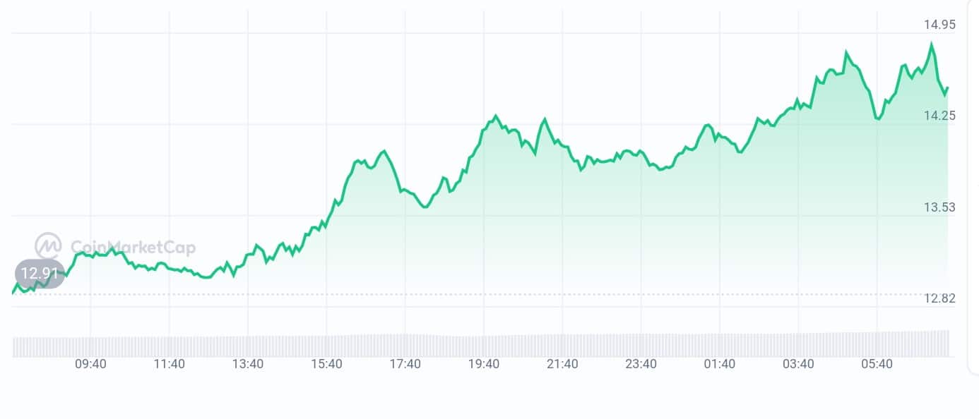 Injective (INJ) is trading at $14.60, up 12.22% in the past 24 hours and 54.41% over the last month, making it a top crypto gainer. Its 24-hour range is $13.03 to $14.89. The sentiment is bullish, with INJ outperforming Ethereum and Bitcoin in the same period and showing strong gains since its token sale.
