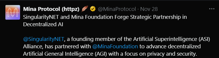 Mina and SingularityNET have partnered to enhance decentralized artificial general intelligence (AGI), emphasizing data security and privacy. SingularityNET, known for its decentralized AI platform, plans to combine its AI infrastructure with Mina Protocol’s zero-knowledge technology. This collaboration aims to create AI-driven decision-making systems for decentralized governance while ensuring robust privacy measures.