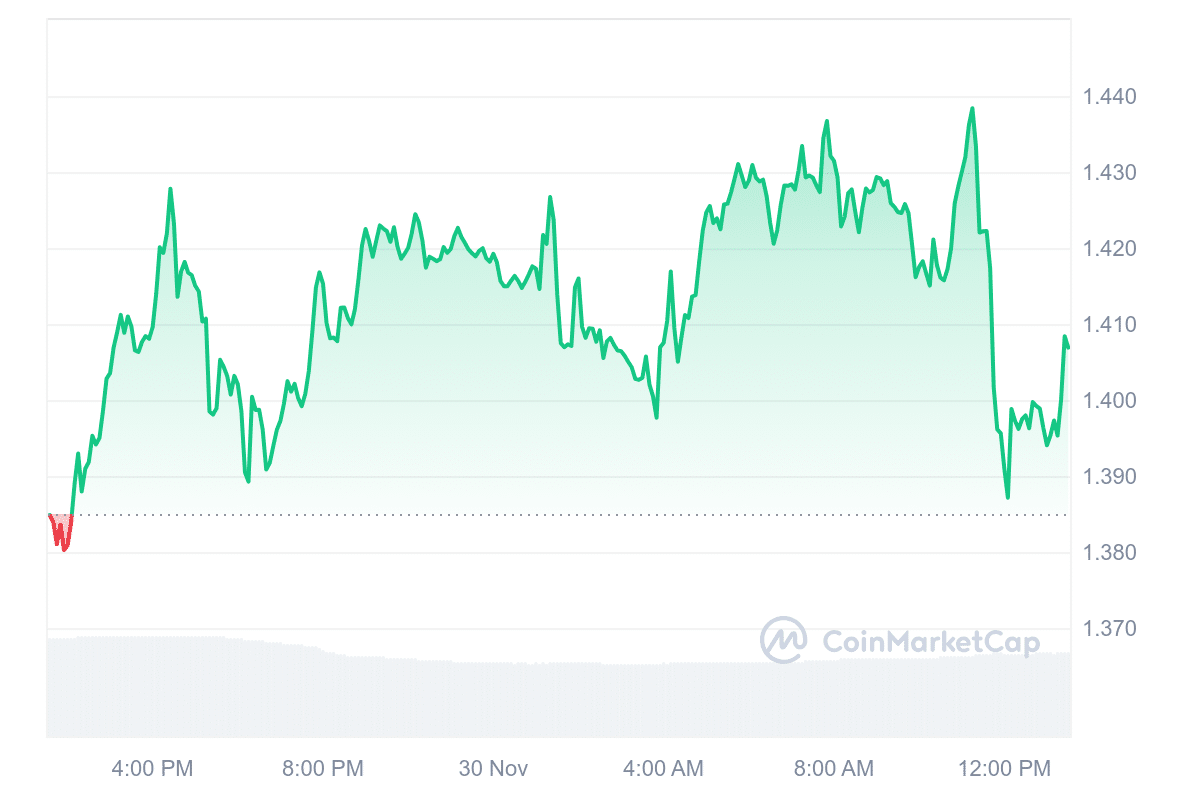 ApeCoin is exchanging hands at $1.41, reflecting a 2.11% increase over the last 24 hours. Its market cap is approximately $1.06 billion, which represents 0.03% of the overall cryptocurrency market. The 24-hour trading volume is reported at $292.72 million, indicating a healthy activity level relative to its size.