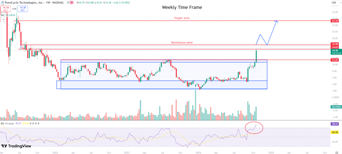 Before concluding on to Q3 2024 results, let’s look into the technical aspect of the stock. On the 24th Oct 2024 trading session, the PCT stock gave +29.59% returns and took rejection exactly from $14.65 on multiple time frames like 5min, 15min, 1hr, 1 day and 1 week, indicating the strength of the resistance.